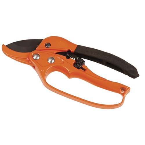 The 8 inch Deluxe Ratcheting shears has hardened steel blade and cuts through branches up to 1 inch in diameter.